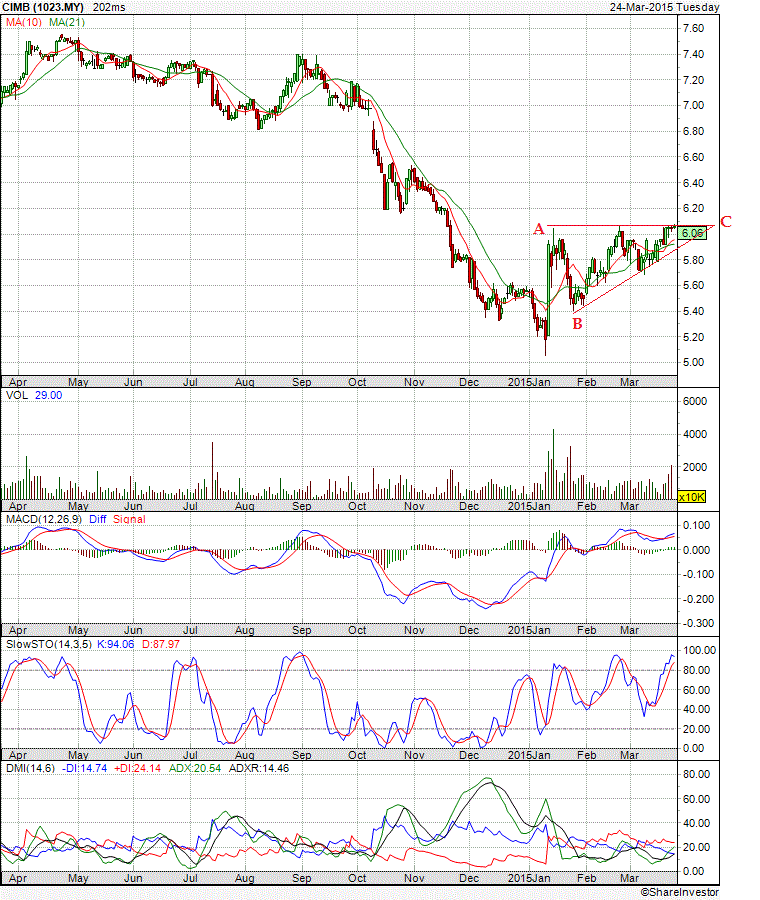 CIMB baru sahaja dipecahkan kepada terbalik segi tiga yang menaik, ABC pada RM6.07.  Kini ia diniagakan pada RM6.09-6.10.  Jumlah dagangan adalah agak kecil.