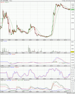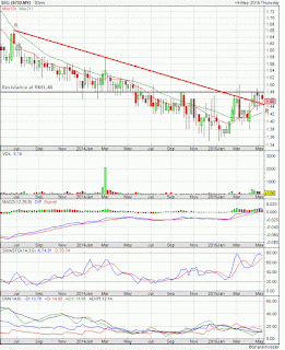 ![]() Jadual: lepas 8 keputusan suku SEG ini ![]() Carta 1: lepas 28 keputusan suku SEG ini Penilaian SEG (ditutup pada RM1.46 semalam) kini diniagakan pada PE 36 kali (berdasarkan EPS lepas 4/4 'daripada 4.11 sen). Pada PE pelbagai ini, SEG dianggap lebih dihargai. SEG dibayar dividen berjumlah 11 sen bagi FY2014. Bagi FY2015, dividen interim sebanyak 7 sen lebih tinggi daripada FY2014 interim sebanyak 5 sen. Dengan andaian dividen akhir adalah sama dengan dividen interim, FY2015 dividen berjumlah 14 sen. Oleh itu, DY SEG adalah sangat menarik pada 10%. Outlook Teknikal SEG memecah di atas garis trend menurun yang terdekat, RR di RM1.45-1.46 pada bulan April. Terbalik dihadkan oleh garis mendatar pada RM1.48. Lihat Carta 2. ![]() Carta 2: Carta mingguan SEG itu pada 14 Mei, 2015_10.30am (Sumber: ShareInvestor.com) Jika SEG boleh mengatasi rintangan pada RM1.48 (sebaik-baiknya, RM1.50 psikologi juga), saham boleh melihat semula yang tinggi pada RM2.00. ![]() Carta 3: Carta monthy SEG itu pada 14 Mei, 2015_10.30am (Sumber: ShareInvestor.com) Kesimpulan Berdasarkan prestasi kewangan yang lebih baik & prospek teknikal sedikit positif, SEG boleh menjadi saham yang baik untuk BUY perdagangan. DY yang tinggi pasti akan menjadikan ia saham pendapatan. . -------------------- KLFX.blogspot.MY - Kelas Saham / Forex / FCPO - RM69