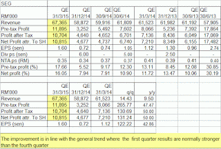Untuk  QE31 / 3/2015, keuntungan bersih SEG meningkat 131% perbandingan suku  tahun sebelumnya atau 50% tahun ke tahun kepada RM10.8 juta manakala  perolehan meningkat sebanyak 14% atau perbandingan suku tahun sebelumnya  10% tahun ke tahun kepada RM67 juta.  Peningkatan ini adalah disebabkan oleh faktor bermusim.