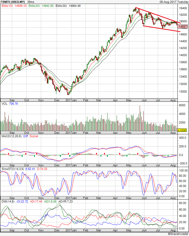 Carta 1: Carta harian FBMKLCI pada 8 Ogos 2017_12.30 (Sumber: Shareinvestor.com) Selepas anda melirik FBM70, FBMSCAP & FBMFLG, keadaan sebenar pasaran mendedahkan dirinya. Pasaran kami telah semakin lemah sejak beberapa minggu lalu. Penyusuan secara tiba-tiba untuk beberapa risalah tinggi adalah tanda amaran lebih banyak jualan yang akan datang.   Carta 2: Carta harian FBM70 pada 8 Ogos 2017_12.30 (Sumber: Shareinvestor.com)   Carta 3: Carta harian FBMFLG pada 8 Ogos 2017_12.30 (Sumber: Shareinvestor.com)   Carta 4: Carta harian FBMSCAP pada 8 Ogos 2017_12.30 (Sumber: Shareinvestor.com) Malah FBMACE yang berani mungkin melambai bendera putih. Ia boleh rosak di bawah aliran menaik. Ini disokong oleh trend -DMI di atas + DMI. Nasib baik, MACD masih berada di atas garis sifar, yang bermaksud bahawa aliran menurun belum dimulakan untuk FBMACE.   Carta 5: Carta harian FBMACE pada 8 Ogos 2017_12.30 (Sumber: Shareinvestor.com) Dua bulan yang lalu saya menulis tentang kelemahan di pasaran dan pembetulan yang mungkin akan datang yang akan memberikan peluang yang lebih baik untuk membeli saham pada harga yang lebih menarik. Pasaran kami telah membetulkan sejak sekarang dan harga pasti lebih menarik sekarang daripada pada bulan Jun. Pada masa-masa seperti ini, anda mesti mengelakkan keinginan untuk berdagang untuk keuntungan kecil. Sebaliknya, anda mesti menegaskan kesungguhan anda untuk melabur untuk jangka masa panjang dan untuk menghadapi kesakitan jangka pendek yang pasti akan datang kerana sesetengah saham anda akan menanggung kerugian jangka pendek sebelum pasaran kembali. Semoga berjaya! -------------------- KLFX.blogspot.MY - Kelas Saham / Forex / FCPO - RM69