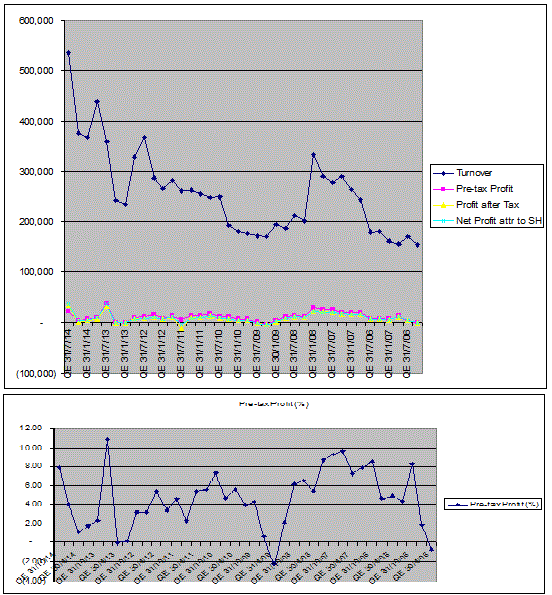Pembangunan Korporat Pada bulan Julai 2014, Jubli Industries Holdings Ltd (Catalist: 5OS) membeli 26% kepentingan dalam EG dari Jupax Enterprise Sdn Bhd dan Tai Yeong Sheng untuk RM21 juta (yang terdiri daripada 19.504.000 saham dan waran 3704000). Ini akan bernilai saham pada kira-kira RM1.05 sesaham (menganggap waran itu berharga RM0.10 setiap satu). Oleh kerana perkembangan ini, pendapatan EG telah meningkat dengan ketara, seperti yang dilihat di bawah. Prestasi Kewangan baru-baru ini (UPDATED) Untuk QE31 / 12/2014 & QE30 / 9/2014, EG melaporkan keuntungan bersih masing-masing RM10.3 juta dan RM7.6 juta. Ini satu peningkatan berbanding keuntungan / (kerugian) sebanyak RM2 juta untuk sebelumnya 9/4. Hasil bagaimanapun kekal pada kira-kira RM200-250 juta suku. Sebab bagi peningkatan yang ketara adalah margin keuntungan yang lebih tinggi daripada 3-5% berbanding dengan +/- 1% sebelum ini. Memandangkan peningkatan segera dalam margin keuntungan, saya hanya boleh menyimpulkan bahawa pemegang saham yang baru telah diluluskan pada beberapa kontrak dengan margin keuntungan yang lebih tinggi untuk EG. ![]() Rajah 1: keputusan EG yang lepas 11/4 (Bersumber: ShareInvestor.com) ![]() Rajah 2: keputusan EG 11 tahun lalu (Bersumber: ShareInvestor.com) Update untuk keputusan Kewangan untuk QE31 / 12/2014 & QE30 / 9/2014 Seorang pembaca, Laut Besar telah menegaskan bahawa keputusan untuk 2 suku lepas dirangsang oleh perkara yang luar biasa, yang saya telah terlepas pandang. Terima kasih, Laut Besar! Saya telah dijadualkan di bawah L P & suku tahunan & tahunan untuk memudahkan pembacaan anda. EG telah mendapat manfaat daripada keuntungan nilai saksama pada merealisasikan aset kewangan sedia-untuk-jualan RM989k & RM1.316 juta pada QE31 / / 9/2014, masing-masing 12/2014 & QE30. Walaupun keuntungan ini dikecualikan, NP masih sangat besar. PER akan dikaji semula dari 1.7 kali kepada 2.0 kali. ![]() Jadual 1: EG yang lepas 11 P suku tahunan & L ![]() Jadual 2: EG yang lepas 10 annuai P & L (tambah unjuran bagi FY15) Pengembangan masa depan Ia melaporkan bahawa EG kini beroperasi berhampiran kapasiti penuh. Ia merancang untuk mengembangkan kapasiti pengeluaran . Apabila kapasiti baru telah dipasang, ia dijangka mencapai perolehan tahunan sebanyak RM2 bilion (atau dua kali ganda pendapatan semasa) Kedudukan Kewangan Pada 31/12/2014, kedudukan kewangan EG ini dianggap agak ketat dengan nisbah semasa pada 1 masa dan nisbah penggearan pada 1.5 kali. Untuk pengembangan kewangan dan juga untuk menurunkan nisbah gearannya, EG mungkin mencadangkan Terbitan Hak tahun ini. Penilaian (Kemaskini) EG (ditutup pada RM0.835 pada 16:00 hari ini) kini didagangkan pada PE semasa 2.0 1.7 kali! (Tiada kesilapan!). Ini menjadikan EG satu saham yang amat menarik. Outlook Teknikal EG telah pecah di atas garis aliran menurunnya, RR pada RM0.40 pada awal 2014. rintangan yang utamanya adalah RM1.00. ![]() Carta 2: carta bulanan EG ini pada Mac 23, 2015_12.30pm (Sumber: ShareInvestor.com) Kesimpulan Berdasarkan prestasi kewangan yang lebih baik, penilaian yang menarik & berlainan teknikal positif, EG adalah saham yang baik untuk pelaburan jangka panjang. Kedudukan kewangan yang lemah adalah satu perkara yang membimbangkan tetapi ini boleh dengan mudah diperbaiki dengan menjalankan Terbitan Hak tahun ini. . -------------------- KLFX.blogspot.MY - Kelas Saham / Forex / FCPO - RM69